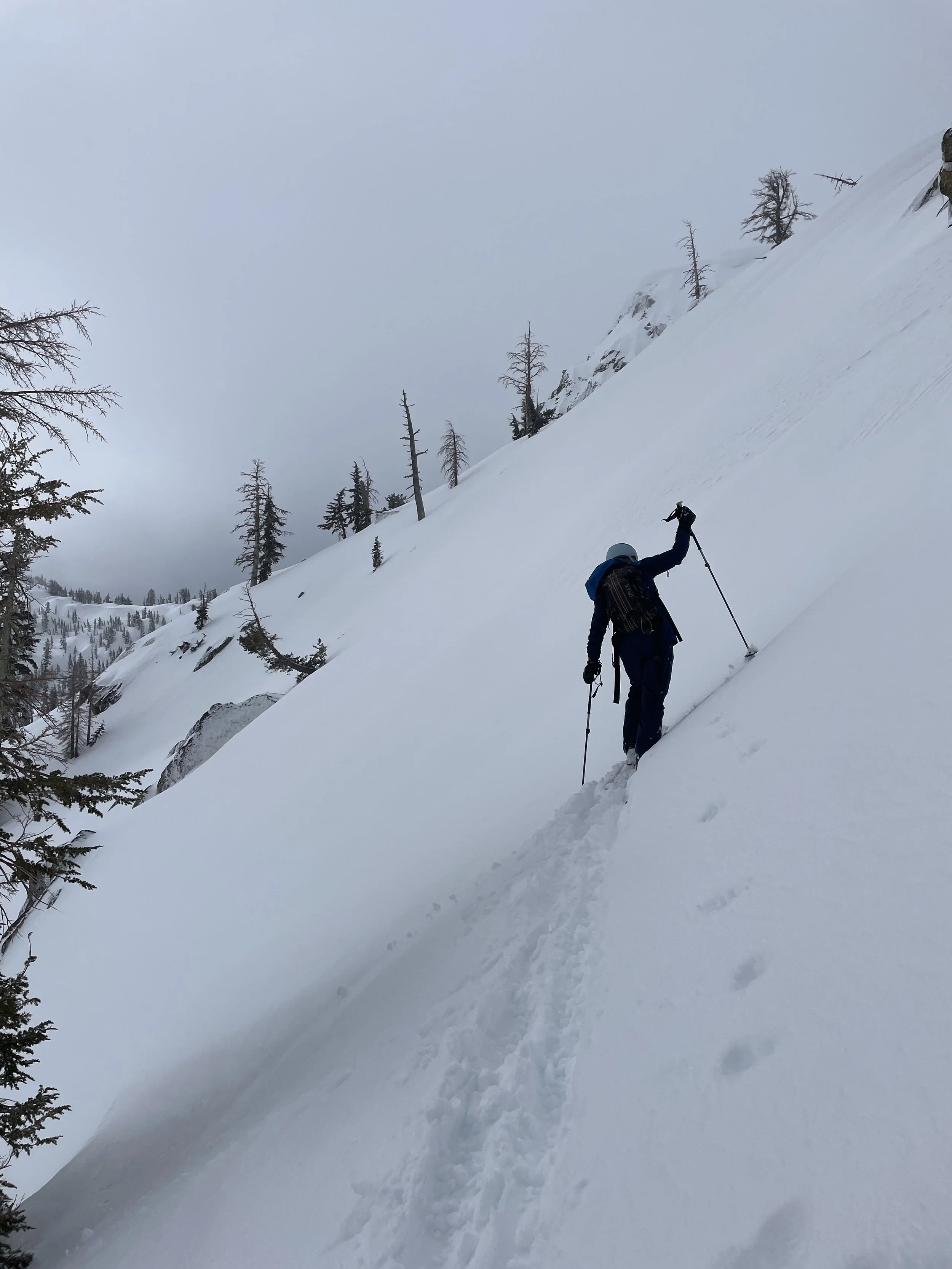 There was fresh snow and some steeper sections. She would ski ahead and I would hang back in spots that felt loaded, just in case. We broke trail. We talked about terrain. We shared the responsibility. It felt measured. Intentional.